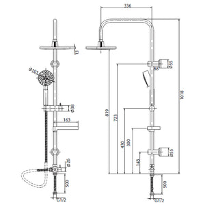 Columna de ducha con plato de 20 cm de diámetro, cuenta con soporte para maneral ajustable y porfa jabón.