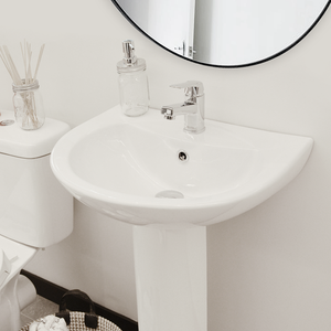DESCRIPCIÓNVanitorio de loza vítrea, color blanco controlado por Pantone.Lavamanos: 13 kg.Pedestal: 5Kg.CAPACIDADNivel máximo 8.5 litros.Nivel hasta el rebalse 6 litros.