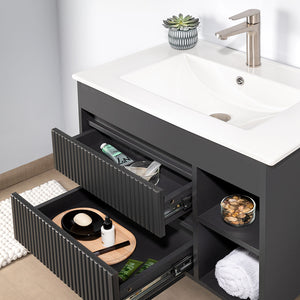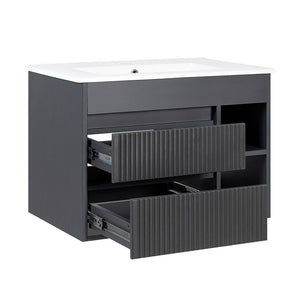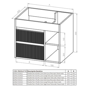 DESCRIPCIÓN Mueble de baño suspendido con dos cajones y dos repisas. Cajones texturados. Diseño sin manillas. MATERIAL Cajón: MDP enchapado con Melamina. Cuerpo del mueble: MDP enchapado con Melamina. ESPESOR Cuerpo de mueble: 16 mm. RESISTENCIA 45 kg Carga máxima. INCLUYE Cubierta Vanitorio Óptima. Set de instalación para muro. Sifón Lavamanos PP 1 1/4'' con salida recta. Desagüe Vanitorio Cromado Pop UP 1 1/4" con rebalse.