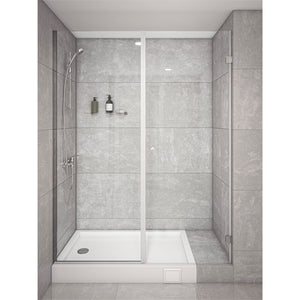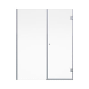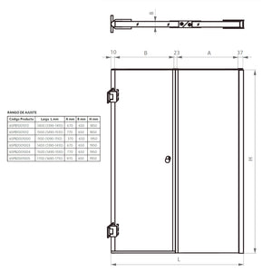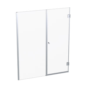 Mampara de Cristal templado de 8mm de espesor. Una Hoja Fija y una Puerta de Abatir. Tirador bala de aluminio de 32mm. Instalación entre muros terminados con revestimiento y sin desaplome.