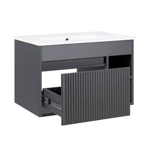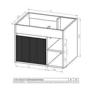 DESCRIPCIÓNMueble de baño suspendido con un cajón texturado y dos repisas.Diseño sin manillas.