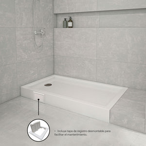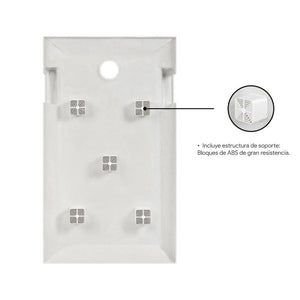 DESCRIPCIÓN Fabricado con distintas capas de fibra de vidrio reforzada con resina, refuerzo estructural con drywall y acabado de ABS; obteniendo un espesor final de 16 mm en la base. Superficie del receptáculo con sistema antideslizante. Profundidad interior máxima de 6 cm y mínima de 3 cm. Altura exterior de 15 cm.