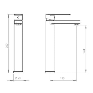 Monomando de 30 cm de Alto. FUNCIONAMIENTO Manilla con giro en 900 que permite mezclar la temperatura del agua. CONEXIÓN Por 2 flexibles MIOx1/2" Hl de 35 cm. TIPO DE CIERRE Cartucho Cerámico 35 mm. MATERIAL Acero inoxidable CONSUMO <7 L/min a 3 bar (Aireador 60%). NORMATIVA Cumple con norma Chilena Nch 700-2011. INCLUYE Set de instalación por Fast Fix, 2 flexibles MIO-HI 1/2" de 35 cm de largo.
