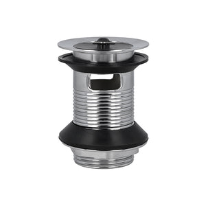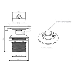 DESCRIPCIÓN Desagüe para lavamanos con tapón, con rebalse, sin tubería ni tuerca de salida. La goma cónica tiene un diseño diferenciador, con una perforación roscada que brinda un sello seguro libre de fugas. Fabricado en acero inoxidable AISI 304, que garantiza alta calidad, flujo e higiene.