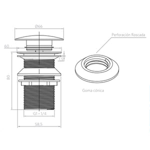 DESCRIPCIÓN Desagüe para lavamanos con sistema Pop-Up con rebalse, sin tubería ni tuerca de salida. La goma cónica tiene un diseño diferenciador, con una perforación roscada que brinda un sello seguro libre de fugas. Fabricado en acero inoxidable AISI 304 (incluido su resorte interior), que garantiza alta calidad, flujo e higiene.